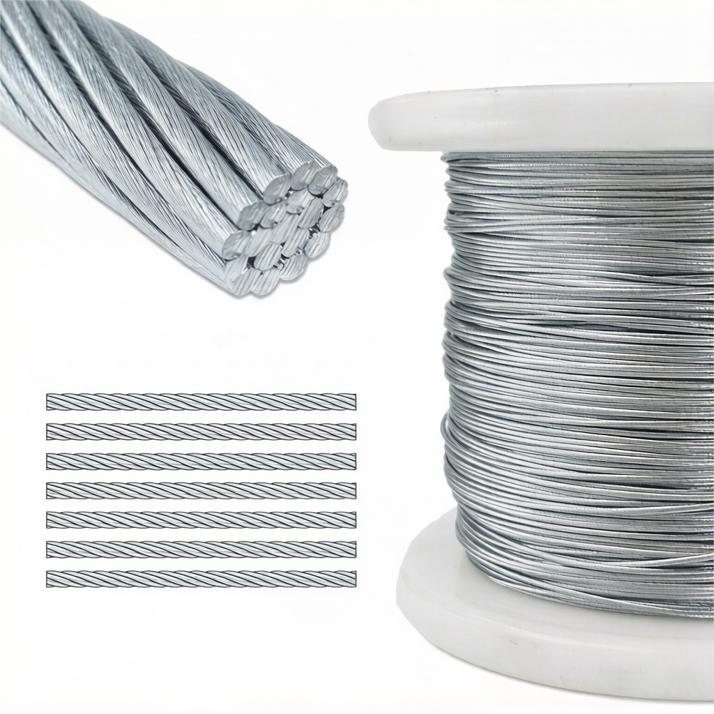 This professional diagram details the full range of standard constructions for galvanized steel wire rope, covering classic single-strand configurations (1×7, 1×19) and industry-standard 6-strand & 8-strand lay designs (including 6×19+IWS, 8×25Fi+IWR). Every rope structure is custom-engineered to match unique project demands for ultimate tensile strength, superior flexibility, and long-lasting fatigue resistance. Clear core type markings (IWS, IWR, WS) specify the internal cable core structure, ensuring these zinc-coated steel wire ropes deliver reliable, rust-resistant performance across heavy lifting, pulling, marine and offshore operations, industrial manufacturing, security fencing, garden installations, and commercial & DIY applications worldwide.