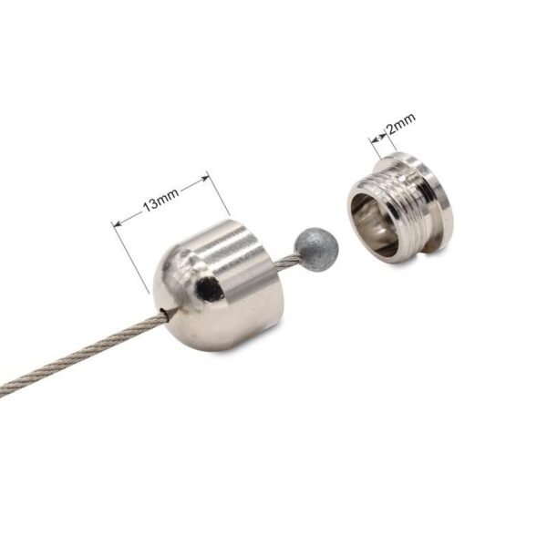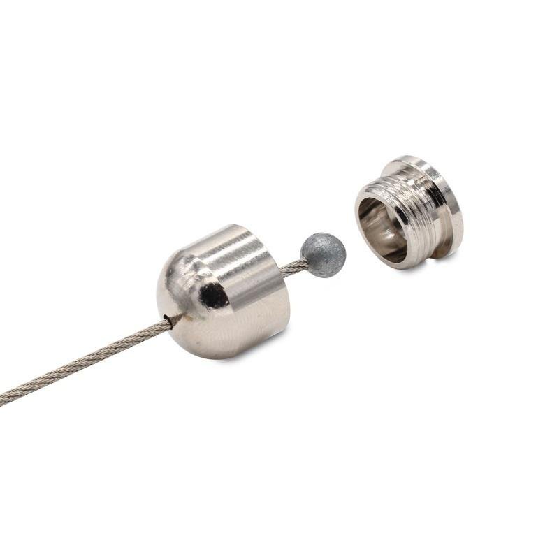 The two-part attachment consists of a male externally threaded base plate and an internally threaded dome cover to encapsulate a wire support stop end. Slot in the dome cover allows rotation of the wire rope through an angle of up to 60 degrees (maximum).