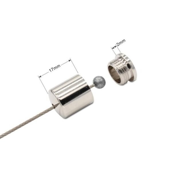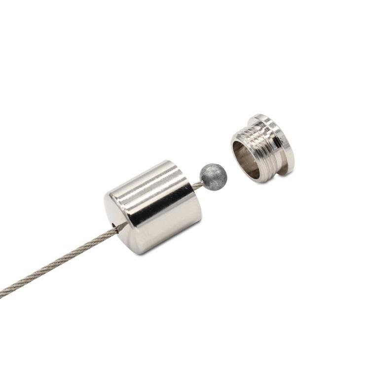 The two-part attachment consists of a male externally threaded base plate and an internally threaded dome cover to encapsulate a wire support stop end. Slot in the dome cover allows rotation of the wire rope through an angle of up to 60 degrees (maximum).